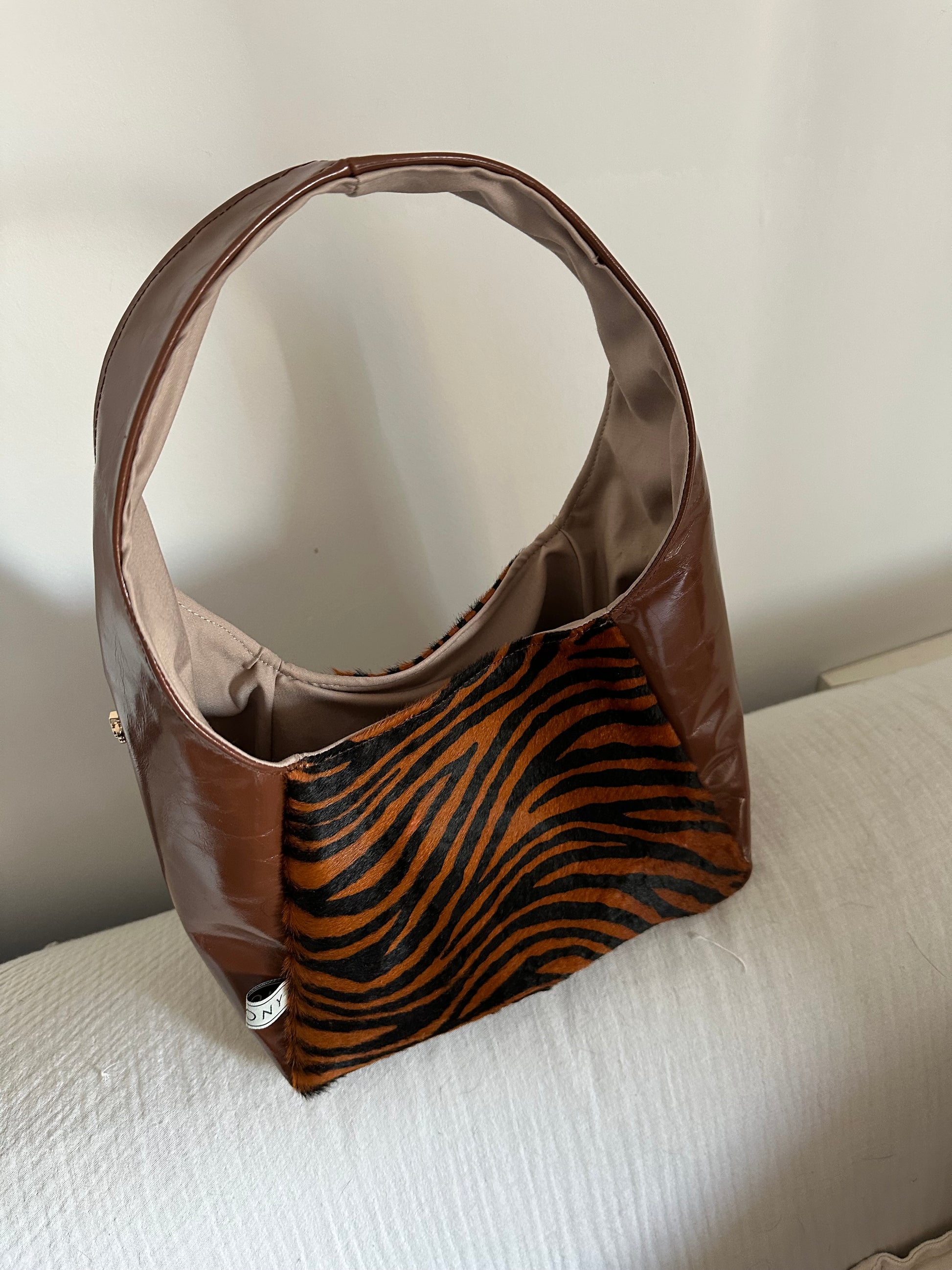 Esterno: 100% vera pelle, vernice marrone e cavallino tigrato. (Il cavallino non è altro che pelle di mucca lavorata così da ottenere questo finto pelo raso effetto “pelo di cavallo”)