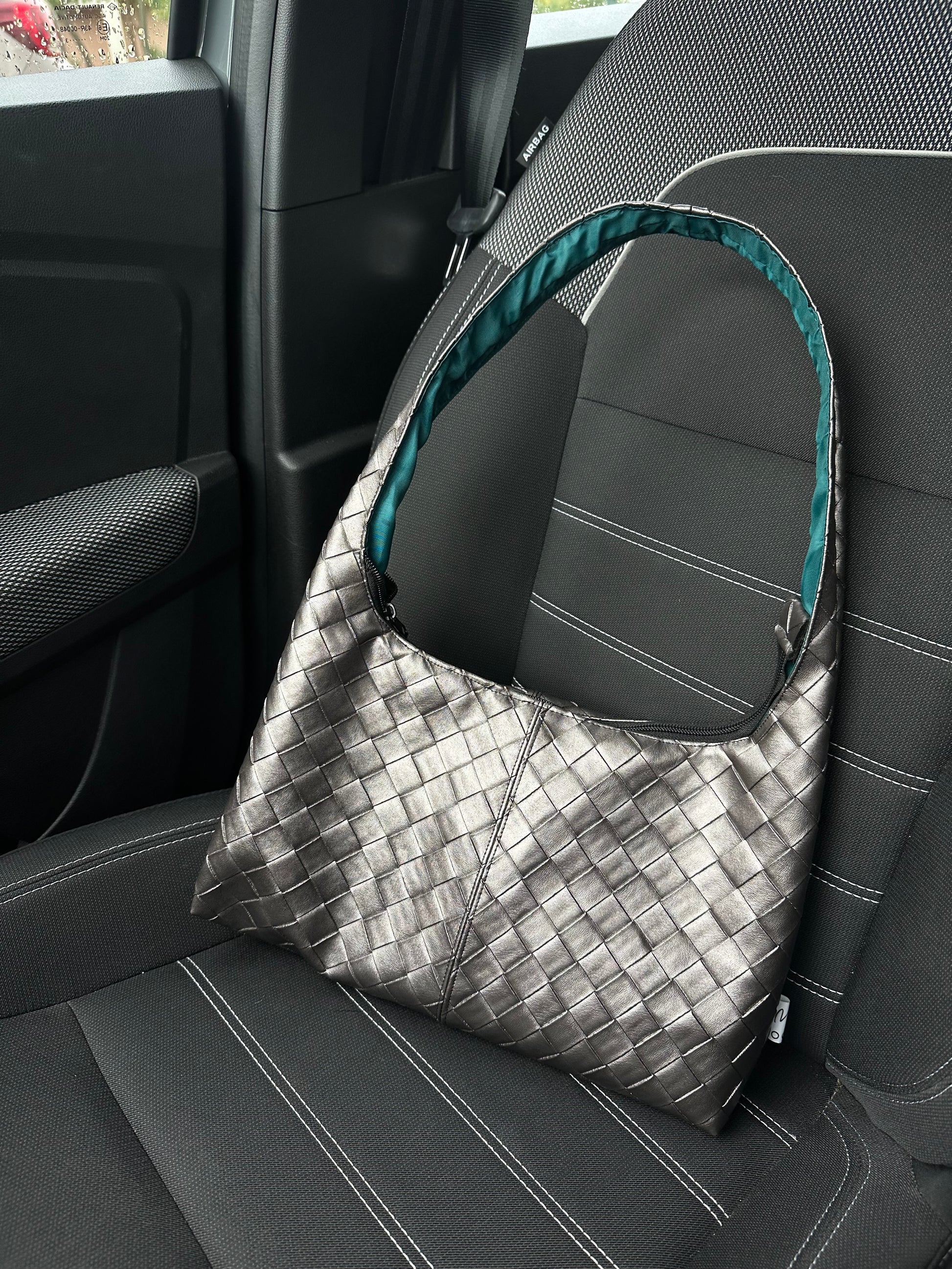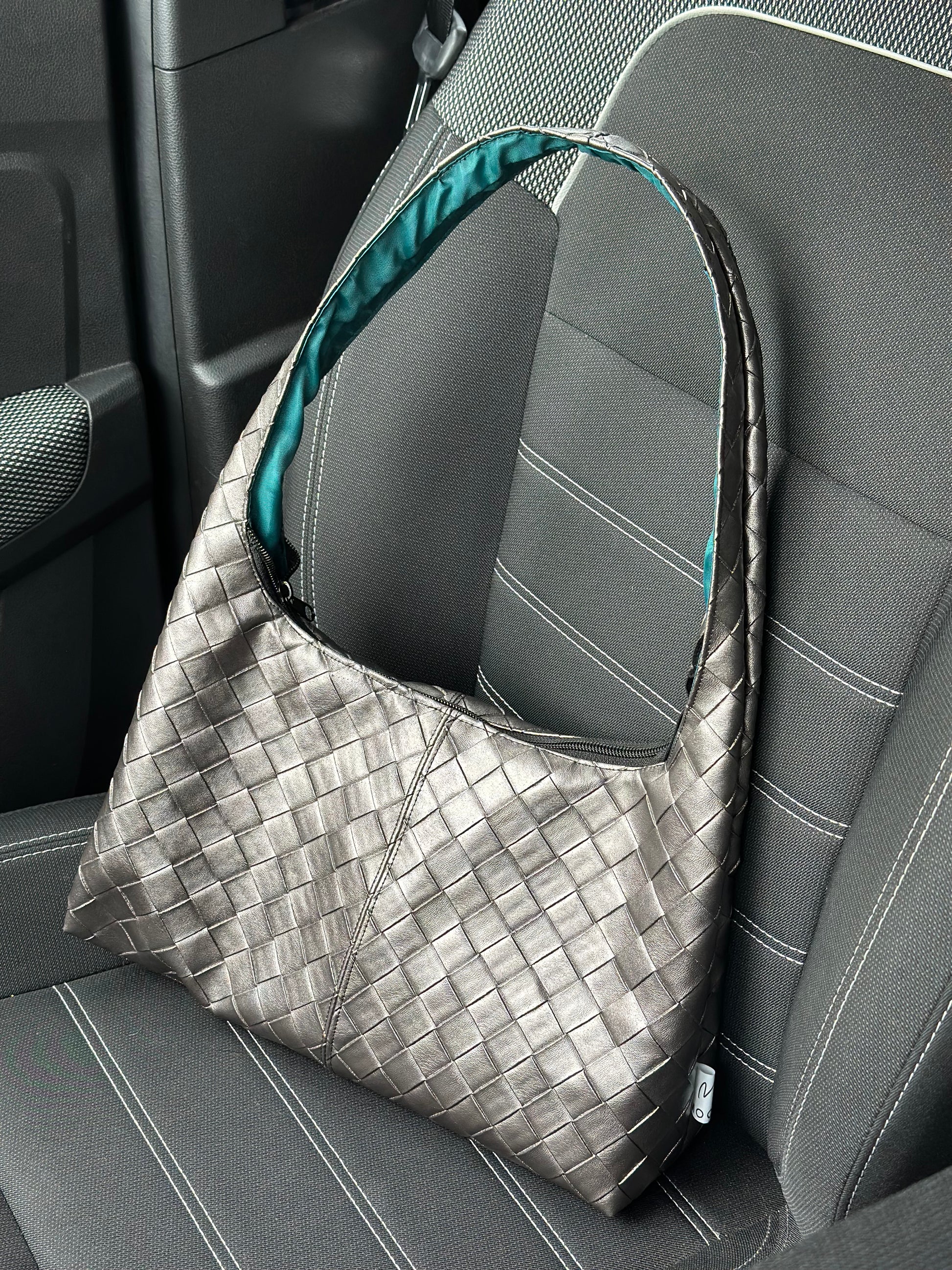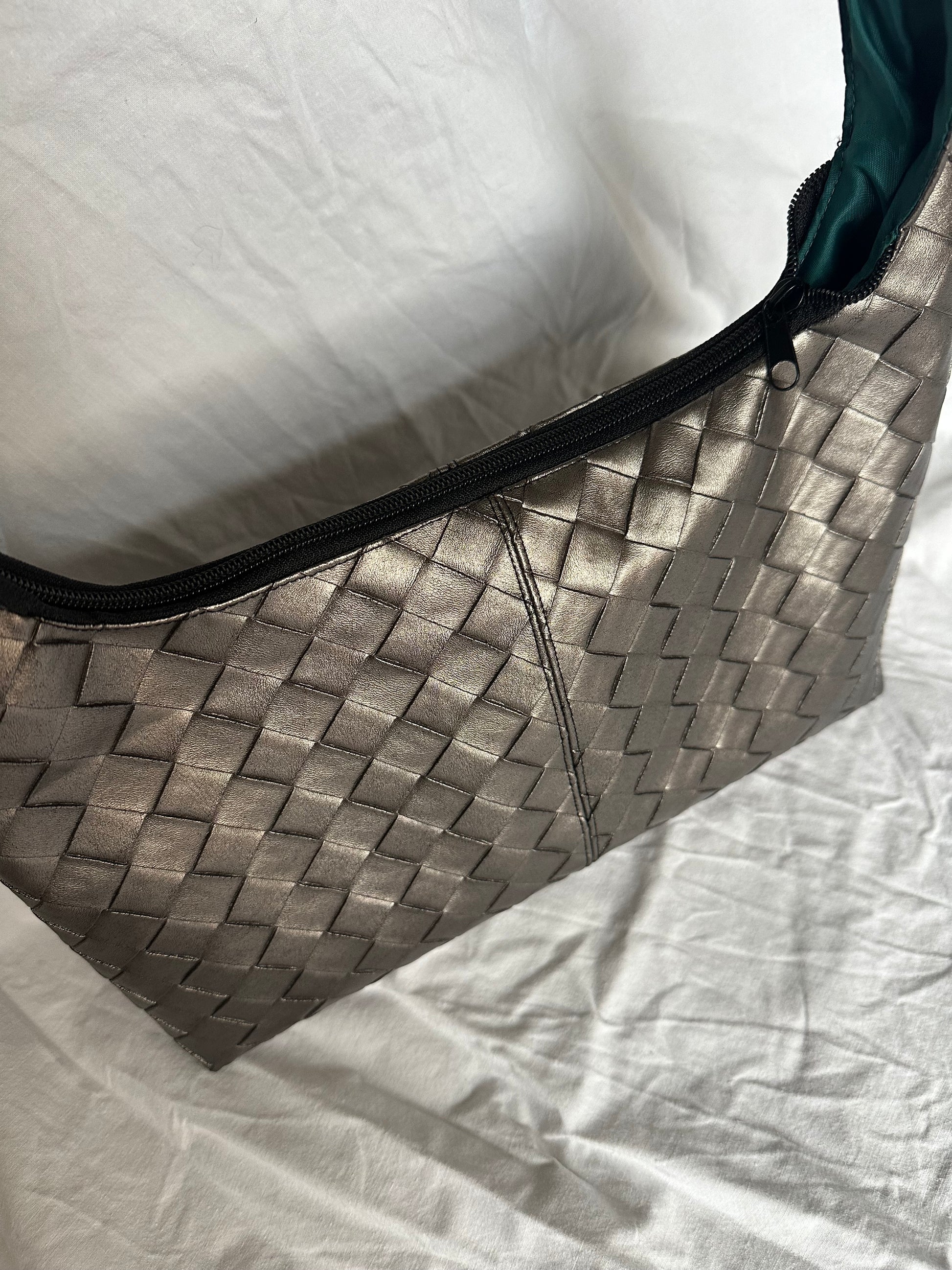 Borsa Hobo in similpelle intrecciata argento con fodera 100% nylon ottanio.
