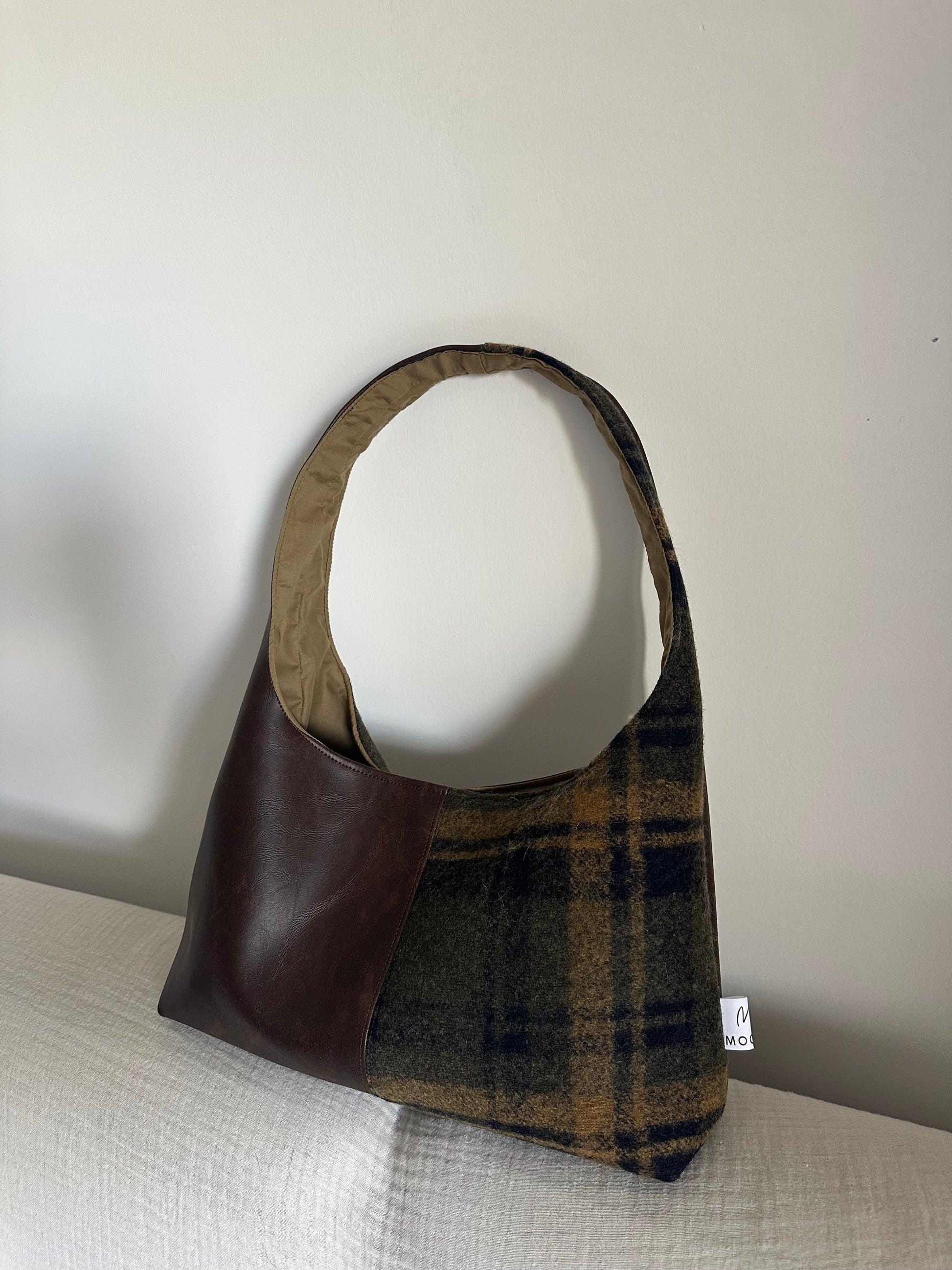 Borsa patchwork in similpelle effetto vintage marrone e tessuto neoprene tartan verde oliva.