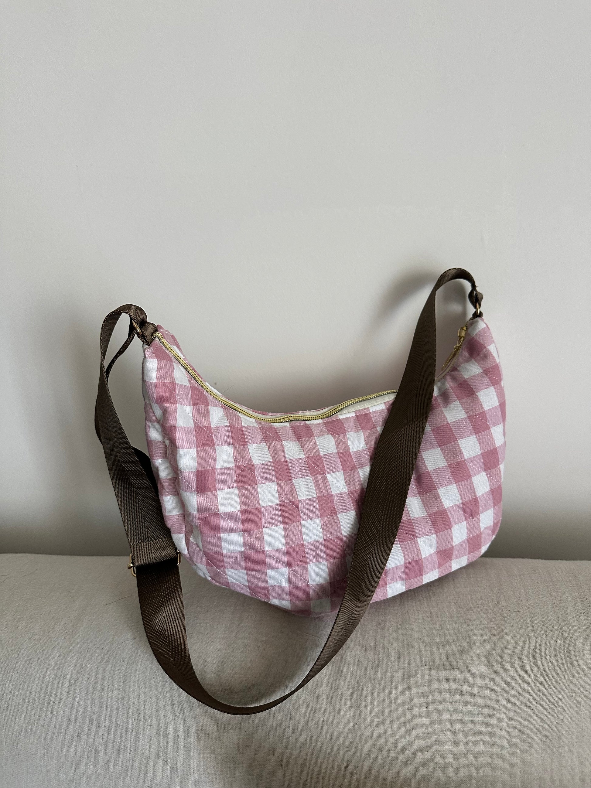 Borsa mezza luna in Vichy rosa con tracolla marrone regolabile.