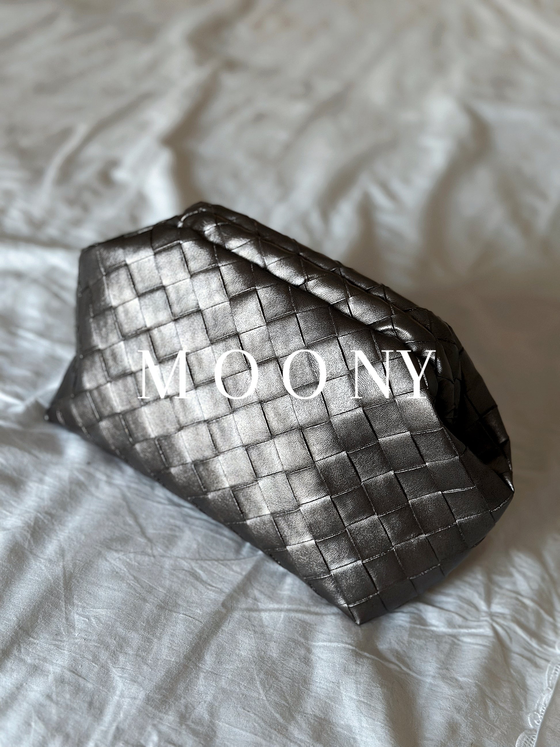 Borsa da indossare a mano in similpelle intrecciata color platino e fodera interna in 100% poliestere color ottanio.